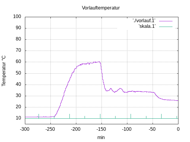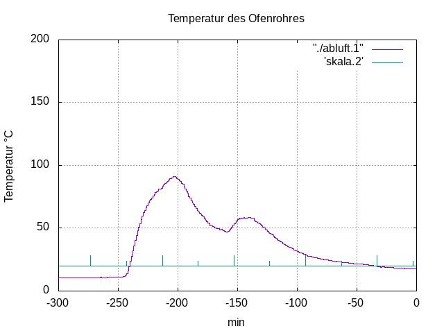 Erläuterungen: Um diese Grafiken überhaupt zu bekommen wird GnuPlot, PHP und ein Webserver gebraucht. Die zusätzliche Skala zeigt die Uhrzeit an. Die Verläufe zeigen, dass die Heizkörper nur wenig warmes Wasser erhalten, der Großteil landet im Warmwasserspeicher für das Brauchwasser. Das zweite Diagramm zeigt die Temperatur des Ofenrohres. Bei -150min ist im ersten Diagramm ein deutlicher Abstieg der Kurve zu sehen, in dem Zeitraum ist der Warmwasserspeicher aufgeheizt worden. Im zweiten Diagramm ist ein weiterer Anstieg im ungefähr gleichen Zeitraum zusehen, dieser erklärt sich dadurch, das Holz nachgelegt wurde. |