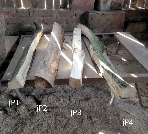 Die Probe jP1 stammt von einem Hainebuchenstamm, wie auch jP4. Die Probe jP2 besteht aus Pappelholz und kommt vom Rand, jP3 kommt mehr aus der Mitte des Stammes. |